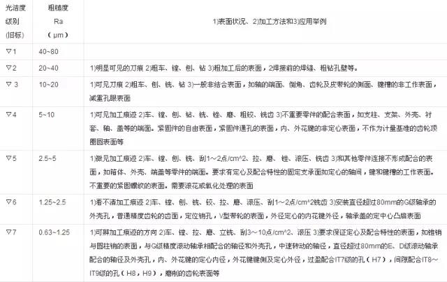 表面光洁度与表面粗糙度有相应的对照表(见下图)。粗糙度有测量的计算公式,而光洁度只能用样板规对照。所以说粗糙度比光洁度更科学严谨。